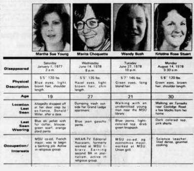 The same day Marita Choquette’s body was found, Wendy Bush disappeared from her Case Hall dorm. She too was a religious MSU co-ed who’d gone on a date with Donald Miller. He strangled her in the Spartan Stadium parking lot after she turned down his advances. He dumped her body in a ditch in Delta Township near where Our Savior Lutheran Church now stands.